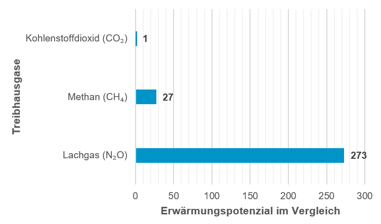 Alle genannten Treibhausgase erwärmen die Atmosphäre – jedoch unterschiedlich stark. So ist Methan ca. 27 Mal, Lachgas ca. 273 Mal klimawirksamer als Kohlendioxid.
