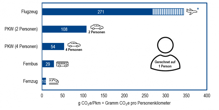 * Hinweis: Die CO₂e-Emissionen des Fluges variieren stark je nach Maschine, Flugklasse, Verbindung etc. sowie Berücksichtigung der Non-CO₂-Effekte.